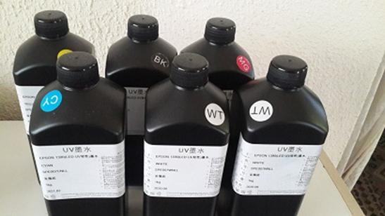 UV CURABLE INKS FOR “CHINA-MADE” UV PRINTERS. SUITABLE FOR PRINTER(P/HEAD) EP1390,EP1400,L1800,PRO3800, DX5,DX6,DX7,DX8,DX10,XP600,etc… OIL BASE INKS, LED UV CURING WAVELENGTH 395nm, BASIC COLORS C/M/Y/K/W, 1L PACKS |